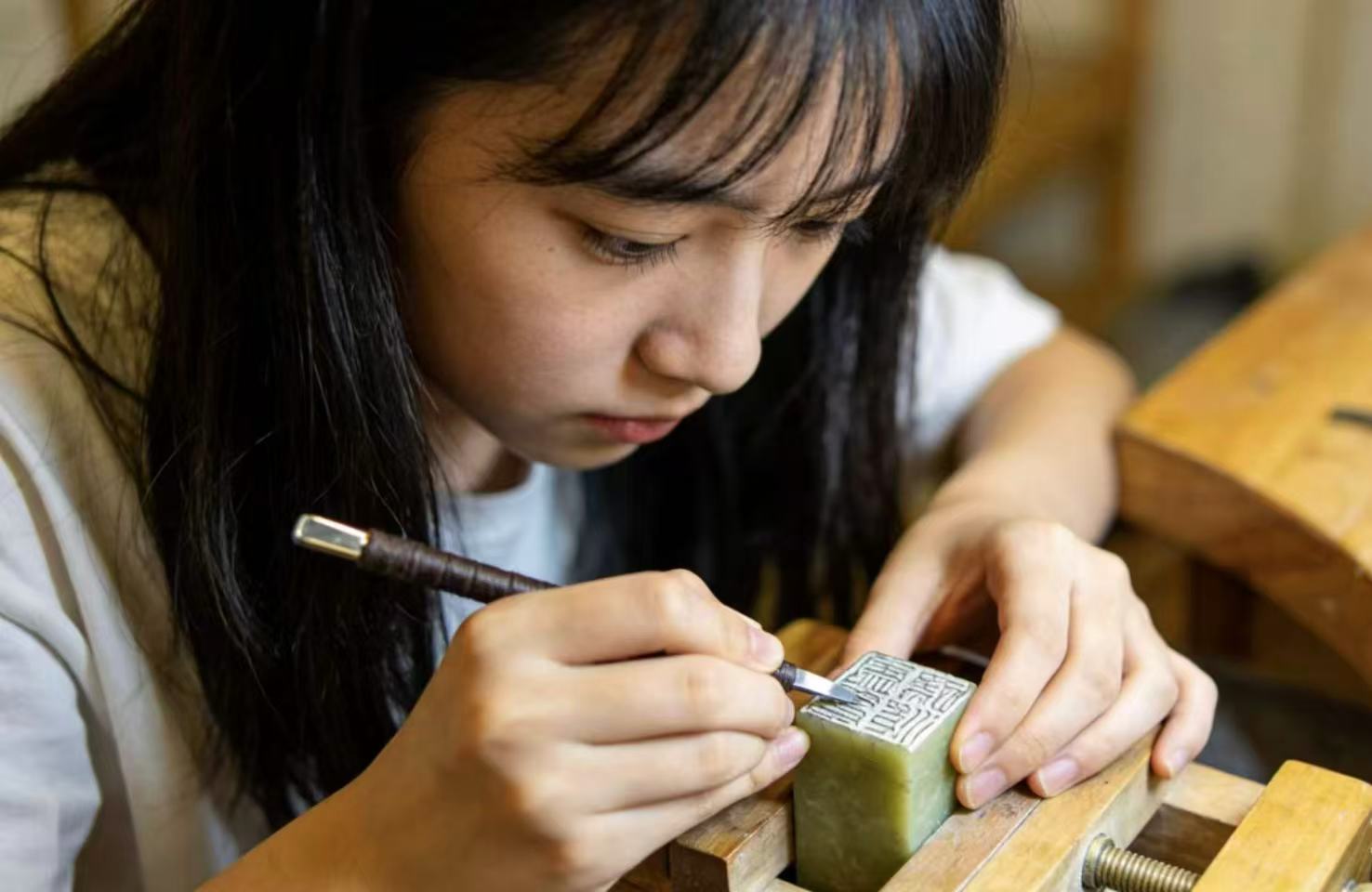 当刻刀落在青田石上,金属与石面接触的那一声清脆声响,会让人突然回到当下。