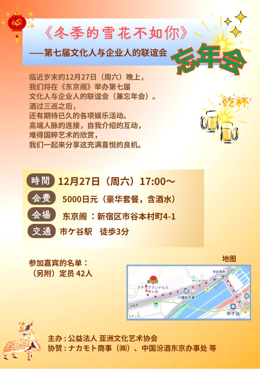 临近岁末的12月27日(周六)晚上,我们将在《东京阁》举办第七届文化人与企业人的联谊会(兼忘年会)。酒过三巡之后,还有期待已久的各项娱乐活动。高端人脉的连接,自我介绍的互动,难得国粹艺术的欣赏,我们一起来分享这充满喜悦的良机。