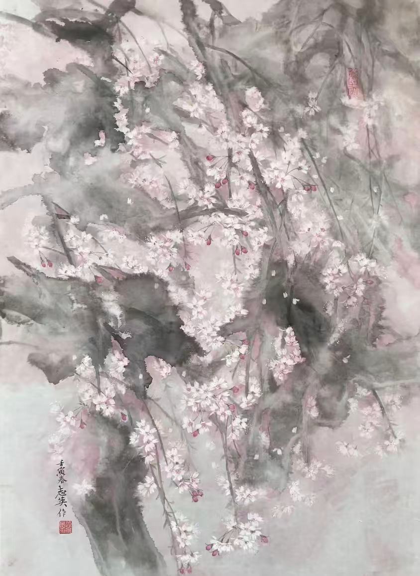 长居在京都的我每年到了樱花季节会很兴奋,几乎访遍京都樱花的名所,山边川畔的樱树都会让我止步。真的是走着走着花开了,走着走着花谢了。 日本有“心灵之眼”这个词,这意味着如果用心去观察,用心去触摸世界便可以看到看不到的东西。开始时画了许多樱花写生稿,逐渐只是观察默记。我不认为“心灵之眼”这仅仅指虚构的世界,可以意味着用心灵去感知,把画樱花比作是在感受生活的力量。创作的过程真的好比忍受漫长寒冷的冬天,用急不可耐地心情等待樱花绽放,多少年来都是怀着这种情结,在白纸上让盛开的花朵之美脱颖而出。然而许多种类的艺术表现形式都难以画出这种梦一般的神奇虚幻。樱花是小花又是白花这两个因素对于表现来说都有局限性。我认为中国水墨画的韻味正合适表现樱花柔情韧度的视觉效果,从花瓣树枝的构成和色彩,用写意的印象才可表现这瞬间可视的画面。五代诗人李煜写了“林花谢了春红, 太匆匆。 无奈朝来寒雨晚来风。胭脂泪, 相留醉, 几时重。 自是人生长恨水长东。”所谓红妆素裹,谁又不是左手年华,右手沧桑,让人哭着懂得,笑着坚强。我体会画樱花也需要坚强和韧性,端详凝滞中用心去留住樱花的表像,进而在画面上显示这种怒花奔放的生命感。会把满空的樱花去比作和谐群体,让整体构图中会有心花的流畅,画出樱花有为人生哲学的深邃,我想这才是一种艺术表达!